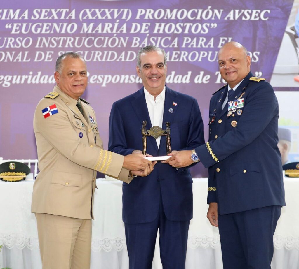 *Santo Domingo.-* El presidente Luis Abinader acompañado del ministro de Defensa teniente general Carlos Fernández Onofre, encabezó este jueves el acto de graduación múltiple del Cuerpo Especializado en Seguridad Aeroportuaria y de la Aviación Civil (CESAC), correspondiente a la Trigésima Sexta Promoción del Curso de Instrucción Básica para el Personal de Seguridad de Aeropuertos “Eugenio María de Hostos”, en el marco de la conmemoración del 29.º aniversario de esa institución.